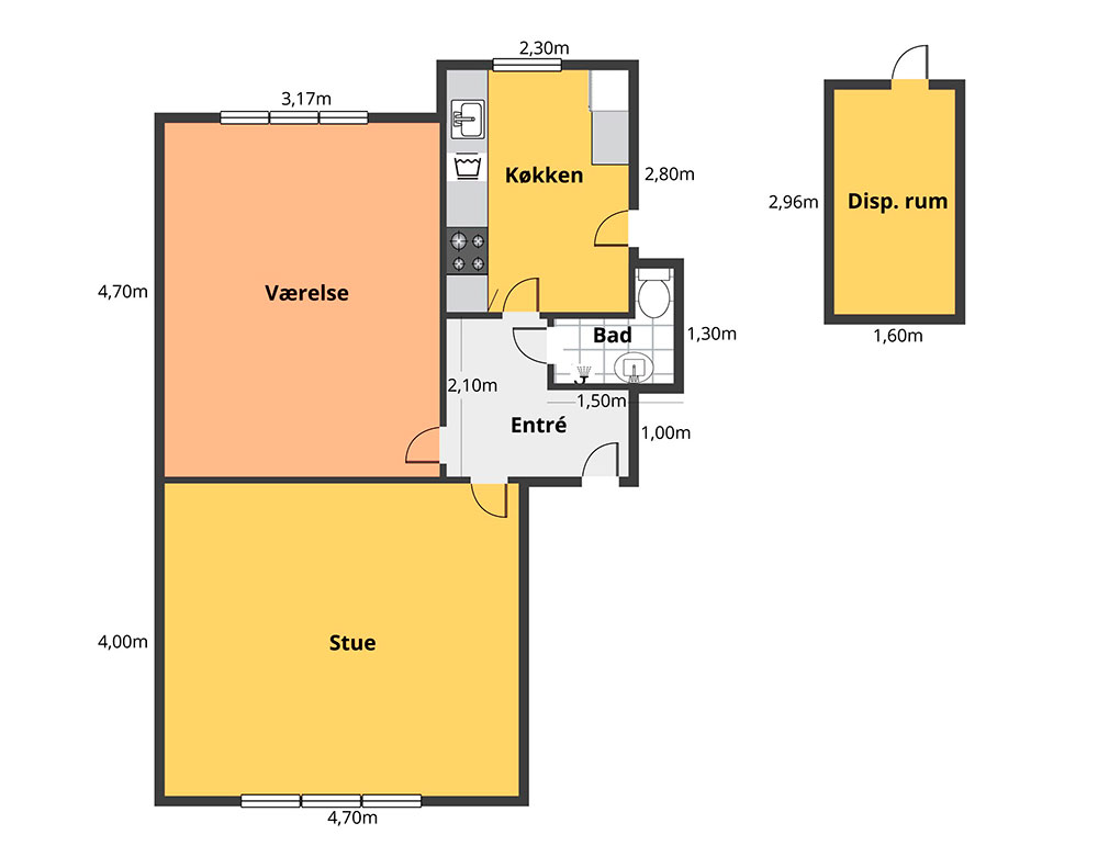 Lejligheden er 64 m2 og indeholder entre, køkken, stue med spiseplads, soveværelse og badeværelse.